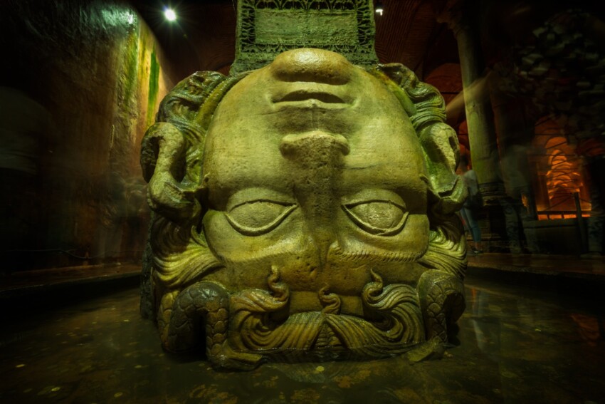 Deux des colonnes ont également une base composée d’une grande tête de Méduse, l’une des Gorgones qui, dans la mythologie grecque, avait le pouvoir de pétrifier tous ceux qui croisaient son regard. Le terme Méduse en grec signifie « protectrice » ou « gardienne », c’est pourquoi on pense que ces têtes avaient été placées ici pour protéger la réserve d’eau. Certaines études auraient également prouvé qu’elles auraient été prélevées sur d’anciens bâtiments romains et ajoutées ultérieurement.